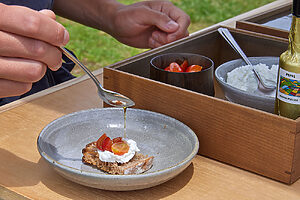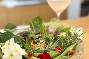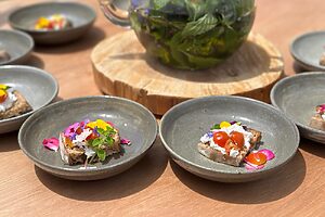 ファームツアーの最後には、クルックフィールズ内のレストラン「prerus(ペルース)」で振る舞われるランチコースの初めの一品、ミニトマトとリコッタのオープンサンドが待っていました。ツアー参加者はハーブや食用花を摘み、それらを使ってオープンサンドをデコレーションできます。思い思いに飾り付けしたひと皿は、鮮やかな見た目に心が躍るだけでなく、参加者同士の会話のきっかけにも。ほんのり甘いハーブアイスティーと一緒にいただきます。