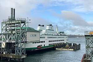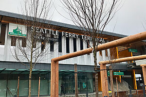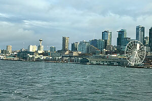 ファウンダーズ・コートという名前の公共のコートがあるベインブリッジ島へは、港のターミナルからフェリーに乗って行きます。フェリーが海上に出ると、シアトルの街並みが一望できて感動的。心地よい海風に吹かれながら約35分の船旅を楽しみます。