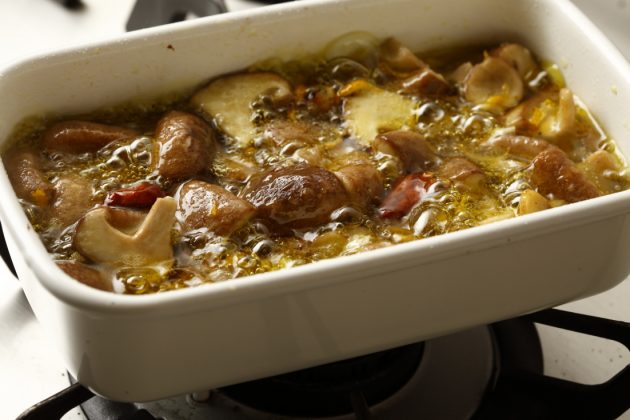 2. ホーロー容器にオリーブオイル、しいたけ、にんにく、塩、鷹の爪、柚子の皮を入れて、弱火で熱し、沸騰してきたらゆっくりと混ぜ合わせ、しいたけに火が通ったら止める。軽く焼いたパンと一緒にいただく。