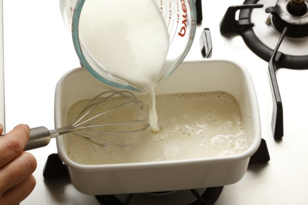 2. 砂糖を加えて溶かし、火を弱火にして、牛乳を加え、混ぜ合わせる。沸騰させないようにする。