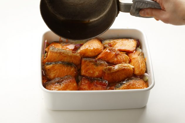4. 鍋にAを入れ、煮立たせてから3に回しかけ、30分ほど置いたら上下を入れ替え、野菜と鮭に味がいきわたるようにする。半日ほどでしっかり味がなじむ。