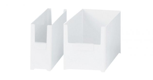 ボックスの中に皿を立て、収納努力が感じられるものの、「使用しているグッズの色がバラバラなせいで片づいた印象がない」のが残念。使うボックスの色も揃え、皿も同色を並べれば、驚くほどすっきり。左隣に冷蔵庫があるので、よく使うグラスはここに入れるなど、動線も考えて配置を決めていけば、片づいた状態をキープしやすい。