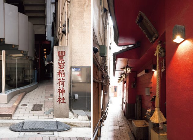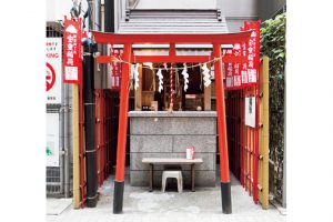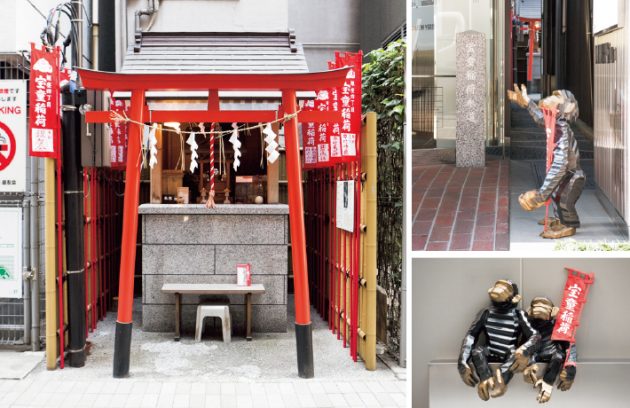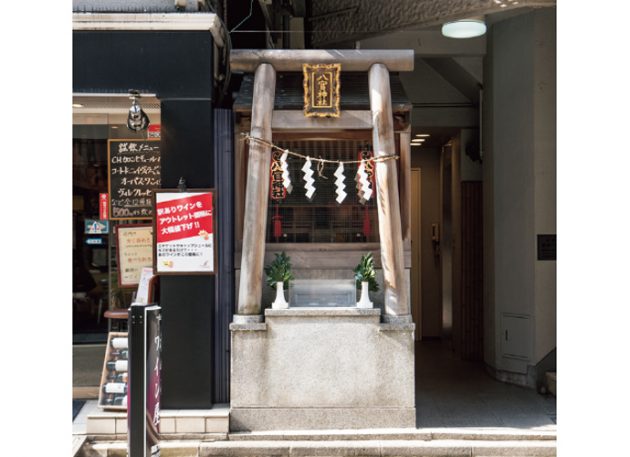 ソニー通りに面したビルの一角。元は穀豊稲荷神社だったが、関東大震災後に改称して再建立。焼失や移転などを経て今の姿に。金運アップ祈願で参拝する人が多い。
