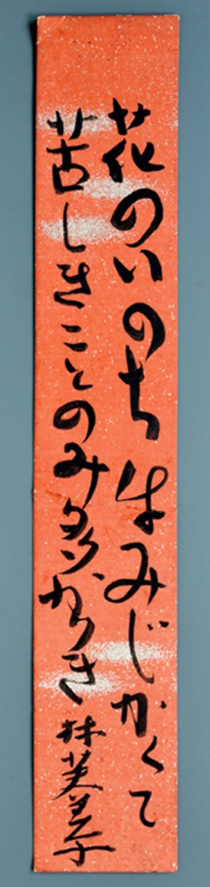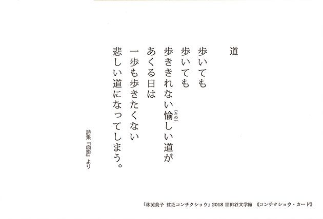 まず、大きな詩が私たちを出迎える。若くて、飾り気がなく、威勢のいい言葉たちだ。はつらつと啖呵を切るような、ときどきちいさくため息をつくような、芙美子の詩は、すっと私のなかに入ってくる。大きなパネルの下には、それぞれの詩が描かれた「コンチクショウ・カード」なるものがあって、ひとり一枚もらうことができる。