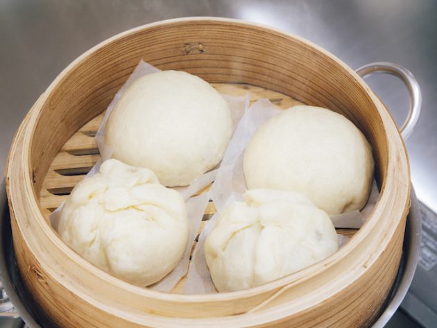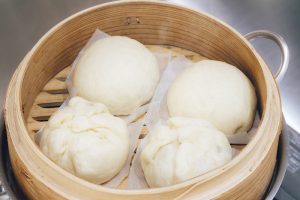 6. 蒸気の上がった蒸し器にクッキングシートを敷いたまんじゅうを入れ強めの火で10分蒸す。