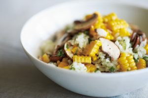 1. とうもろこしは包丁で実をそぐ。マッシュルームは石づきを除き、薄切りにする。