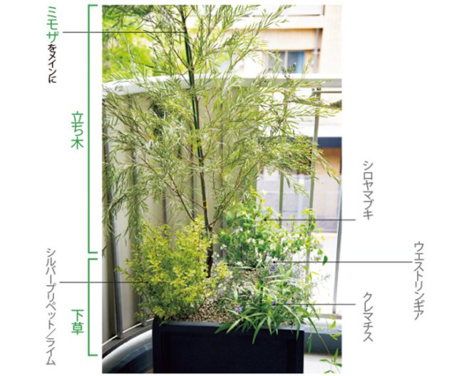 ベランダの一番左に位置するプランター。この鉢の中心はミモザ。