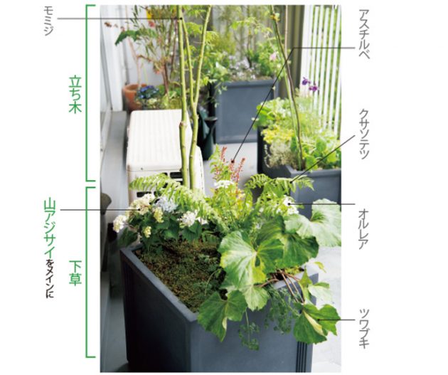 「下草にはツワブキやギザギザとしたクサソテツなど、葉の形が楽しい山野草を。枝や茎が長いものが多いですが、鉢からはみ出すくらいが素敵です」