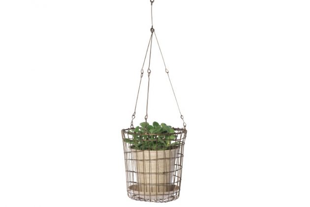 ゴールドのアイアンワイヤーを使った吊り下げ式のかご型鉢カバー。手持ちの鉢と皿を入れて。直径〈上部〉15×高さ16×全長50cm。アイアンハンギング GD L 2,050円〈税込み〉(ガーデニング日和)