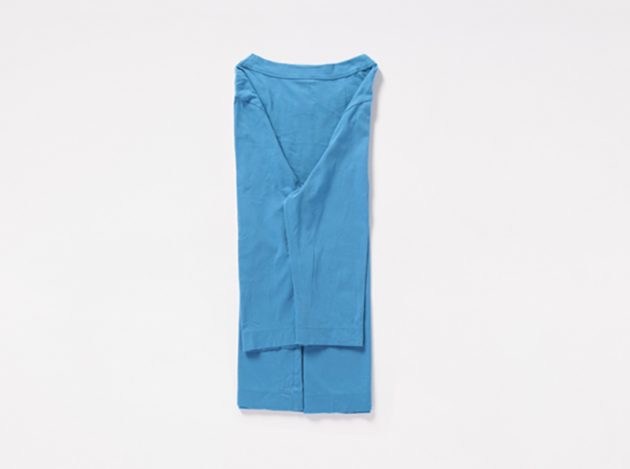 (2)左右の身頃を内側に折り、袖ぐりの縫い目に沿って袖を折る。