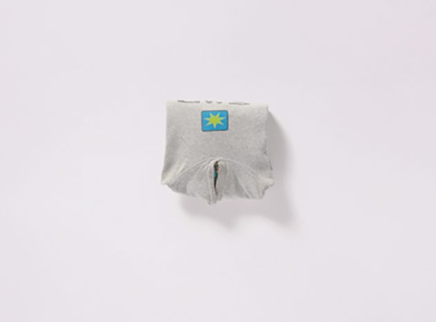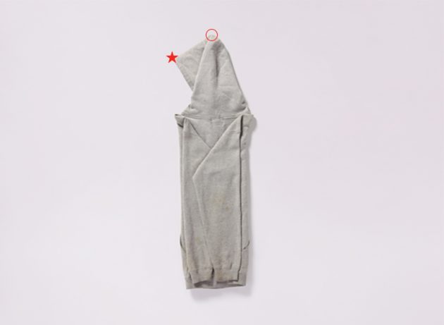(2)左右の身頃を折り、袖ぐりの縫い目に沿って袖を折る。フードは左右の顔脇の部分(★)を揃えて頂点(○)を引っぱると、きれいに整う。