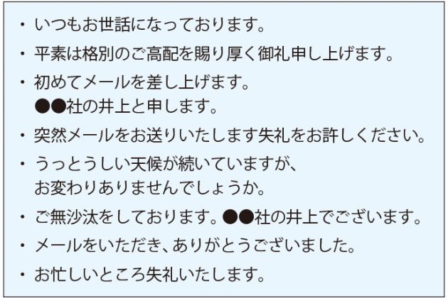 簡潔に趣旨を伝えるのがメールの利点とはいえ、相手に好印象を与えるためにも、冒頭で礼儀正しい挨拶をしたいもの。日頃お世話になっていることへのお礼、簡単な時候の挨拶や相手の健康を気遣う言葉など、関係性や場面に応じて使い分けを。件名で触れていても、本文の早い段階で自分の名乗りをすませるのも丁寧。初めての相手の場合、その旨を伝える一言と紹介者なども書き添えよう。ただし、初めて連絡する相手に使う「●●と申します」という言葉を、面識のある相手に使うのは不自然。「先日お目にかかりました井上でございます」などがふさわしい。