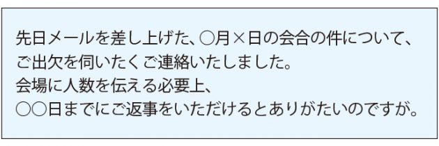 会合の出欠の返事など、期日を伝えたのにもかかわらず、返信が来ない場合もあるだろう。再度意向を確認するメールを送る場合、相手を責めるような文言は避けるようにしよう。目的は、相手に早く返事をしてもらうこと。相手の行動を自然と促すような、柔らかい言い回しを使いたい。