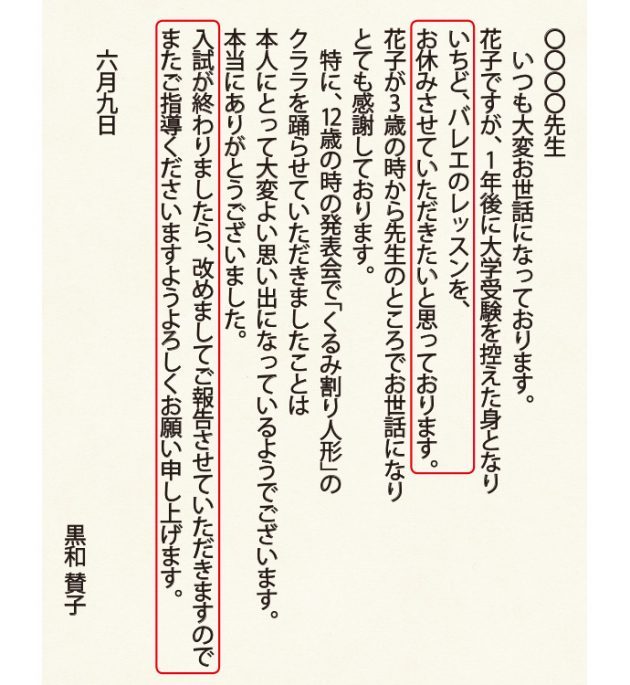 花子ですが、 年後に大学受験を控えた身となり いちど、バレエのレッスンを、 お休みさせていただきたいと思っております。