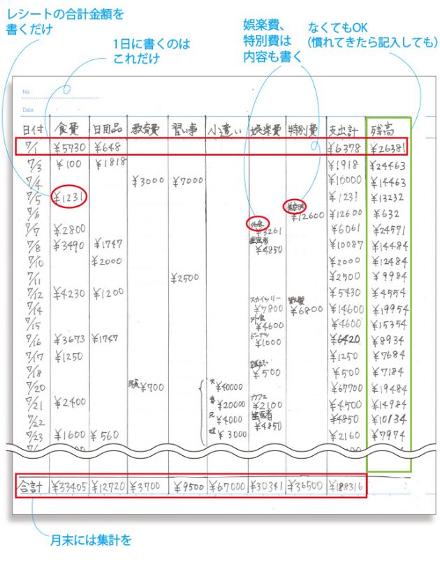 「1行家計簿」1カ月の見本。毎日1行書き、月末には集計をするだけ。