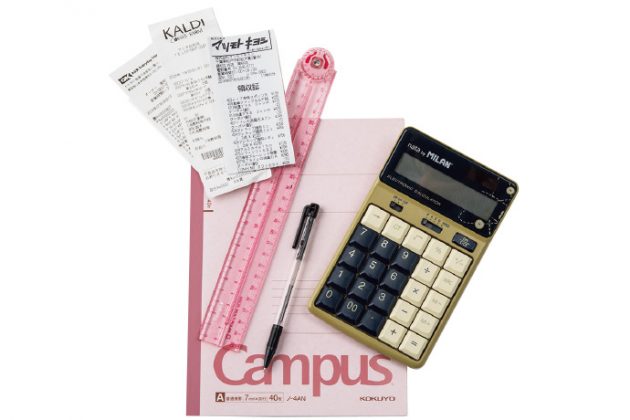 特別なものは必要なし! 手持ちのノートが家計簿に。準備するのはノート(何でも)、レシート、定規、ボールペン、電卓。携帯電話の電卓機能でもOK。