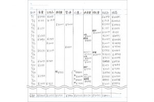 費目が決定したら、記入枠を作る。費目の数によって、記入枠の幅を調整し、下図のように定規で線を引く。一番上の行に日付と費目名を書き入れ、一番下の行は合計額の欄に。