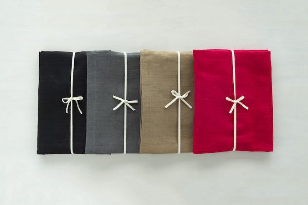 何より生地がすこぶる上質なんです。リトアニア産のリネンを使った厚手の生地は、とても頼もしい触り心地がします。リネンは、天然素材の中でも特に丈夫さが強み。吸水性に優れていて乾きが早く、繊維の中に雑菌をためにくいとも言われています。だからこそエプロンにはもってこいの素材。買った直後はパリッとしていますが、ジャブジャブ洗うたびに、くたっとした何とも言えない風合いに進化していくのも、天然素材ならではの特徴でしょう。