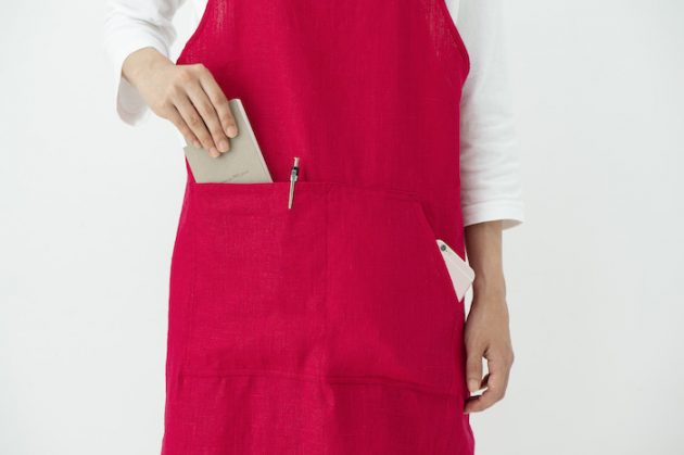 作業のしやすさつながりでいうと、ポケットの存在も欠かせないでしょう。エプロンの中央に大きめのポケットがあって、右は上から出し入れするように、左は横から使うように分けられています。物が落ちにくい、横から入れるポケットにはスマホを入れて、上から入れるポケットにはふきんをかけておく、なんて使い方もいいですね。