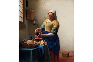 「青と黄色といういかにもフェルメールらしい色が使われています。そして、絵の中に描かれている人物は1人。牛乳を注ぐことに神経を集中させている無心の様がリアリティを感じさせます。構図という点では、人物を少しでも右か左にずらすと絵のバランスがガタッと崩れてしまいます。ここしかないという構図です」(千足伸行さん)