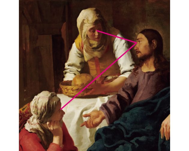 「当時、ヨーロッパの宗教画ではよく描かれていたテーマ。フェルメールには珍しく明暗がはっきりしています。カラヴァッジオの画風の影響を受けていると考えられ、興味深いですね。構図的には中央のマルタが頂点になった三角形で安定していて、キリストがマリアを指さしていることで見る者の視線の流れを促します」(千足さん)