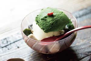上野公園内にある日本料理店『韻松亭(いんしょうてい)』の茶室で営業している甘味処。もとは和室の小上がりだった場所を喫茶室にしており、テーブルには船板を使用するなど、歴史ある雰囲気のなかでランチや甘いものが食べられる。人気メニューのひとつが、手づくりしている豆乳アイスと抹茶アイスがたっぷりとのったクリームあんみつ。優しい豆乳の甘みと濃い抹茶の風味に、もちもちした生麩や寒天、赤えんどう豆でアクセントを加えた、最後まで飽きずに美味しく味わえる一品となっている。