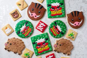 2019年の干支であるイノシシやウリボウ、お正月らしい獅子舞を描いたアイシングクッキーは、お年賀や手みやげにおすすめ。1枚入りと4枚セットの2種類を用意。