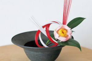 「たくさんの花を買わなくても、椿や松をひと枝いけて水引をあしらうだけで、素敵なお正月のしつらいになります。器は煮物の鉢など、家にあるものを使って」。水引は、先端が下向きに垂れずにきゅっと上がるような形を作って飾るのが縁起がよい。