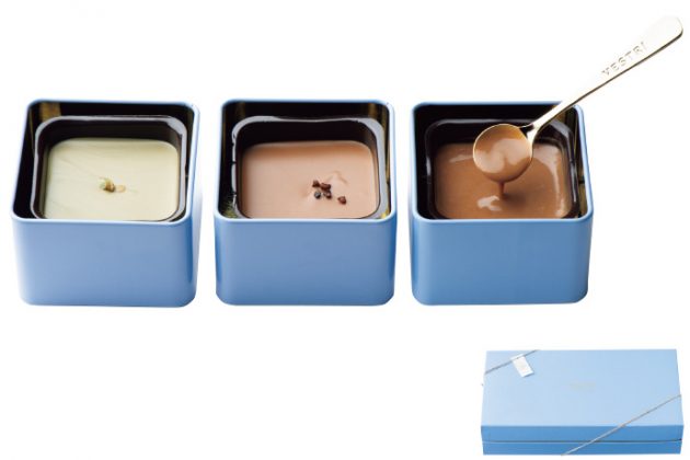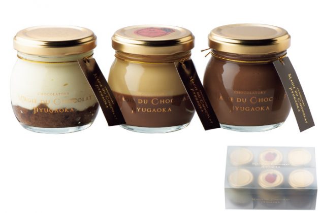 「自由が丘生チョコプリン」は、焙煎で香ばしさを引き出したガーナ産カカオ豆を70%含有するチョコレートがベース。ほかにオレンジ系とホワイトチョコ系を加えた計3種がそれぞれ2個入る。食べ比べるのも楽しい。