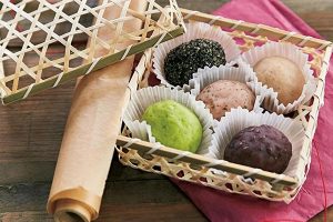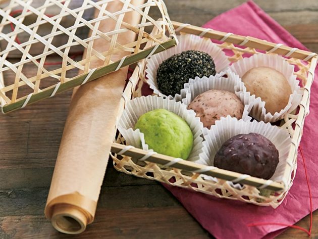 紙のマフィンカップにおはぎを1つずつ入れて、ちょうどいいサイズのカゴや箱に5色をセット。写真のカゴは麺類のギフトが入っていたもの。乾かないようにクッキングシートを上にのせてふたをし、赤いラッピングペーパーを帯状に巻いた上から紐で結ぶ。