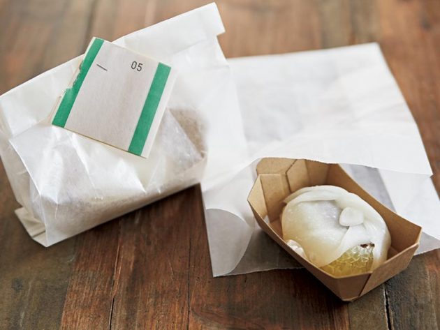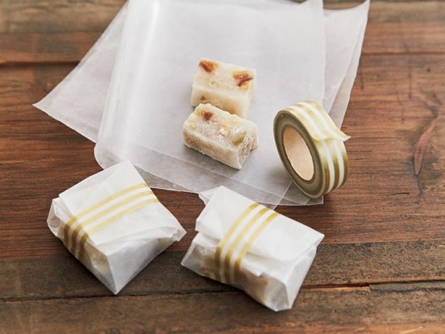 ぎゅうひはくっつきやすいので、一度にたくさん包まず、2つずつを目安にしよう。使うのは、料理用のクッキングシート。正方形にカットしたもので、ぎゅうひをふんわりとラフに包み、マスキングテープで中央をぐるりと巻いて留める。潰れないよう、やさしく扱って。