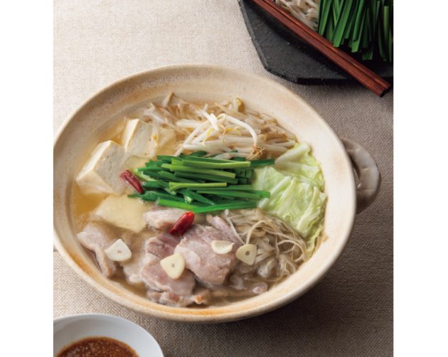 《塩豚のさっぱり鍋》にんにく入りのもつ鍋風。塩豚は作り置くと便利。