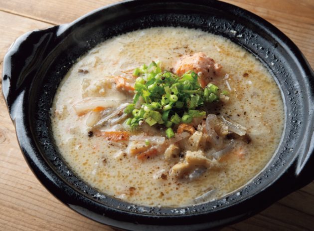 大根100g、人参15g、ごぼう20g、こんにゃく(アク抜きしたもの)20g、鮭の切り身100g、油揚げ20g、だし500ml、味噌大さじ1、酒粕大さじ4〜5、芹(みじん切り)適量、黒七味適宜