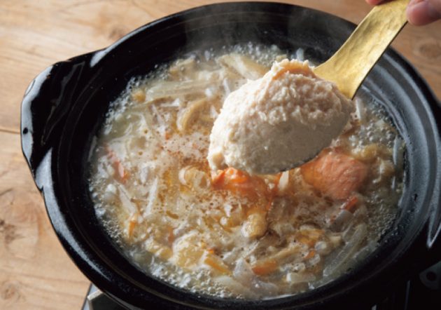 4. 鮭をサイコロ状に切り、3に加える。ひと煮立ちしたら味噌、酒粕を溶き入れ、軽く煮て火を止める。芹をのせ、好みで黒七味を振る。