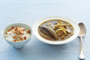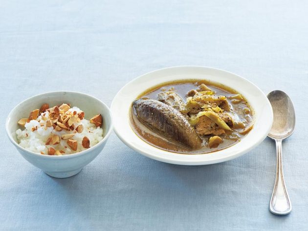 なすは最初に焼きつけて油を染み込ませれば、長時間煮込む必要がなくなる。ごはんにはカレーと相性がいいナッツ類を混ぜて。
