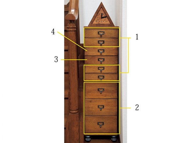 雑貨店で見つけたちょうどよいサイズのチェスト。長女一家と共用している。 1.娘家族の引き出し 娘夫婦…