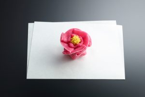 表具に使われる糊の原料でもある小麦粉。これを使った生地を薄くのばし、白餡を包んで紅色の牡丹をかたどった。複雑な折り方でも折れや割れが出ないよう工夫している。