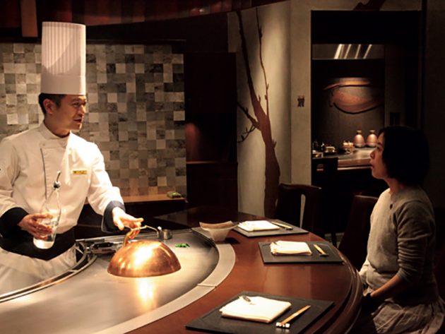 リニューアルを機に登場したのがこちらの鉄板焼きの店。西洋ワサビと味噌を合わせたソースや、桜鱒を昆布で包んで焼いたもの、上質な素材を焼くだけにとどまらず、和とフレンチ両方のテイストを取り入れた、創意工夫あふれる料理はどれも印象に残る。椅子や食器など、細部にまでこだわり抜いた空間も魅力。目の前で腕をふるうシェフとの会話も楽しい。