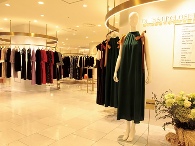 3月に新しく誕生した売り場。結婚パーティー、同窓会、リゾートなど、シーンに合わせたドレスやアクセサリーが揃う。「ミュベール(髙島屋限定のドレスライン)」や「セルフポートレート」など旬の約30ブランドを国内外から厳選。価格も3万円〜20万円と幅広く、多彩な洋服は、見ているだけで楽しい。バイヤー・福場由実さんの着こなし(写真)も参考に。