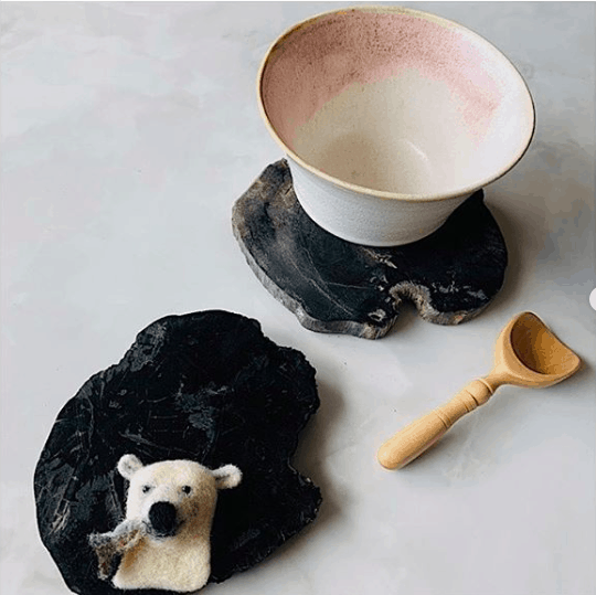 目黒・不動前さんぽで出合ったという『Forchetta(フォルケッタ)』の佇まいが美しいさくら色の器。オルネドフォイユで購入した、コースターとコーヒースプーンとの相性がぴったりですね。