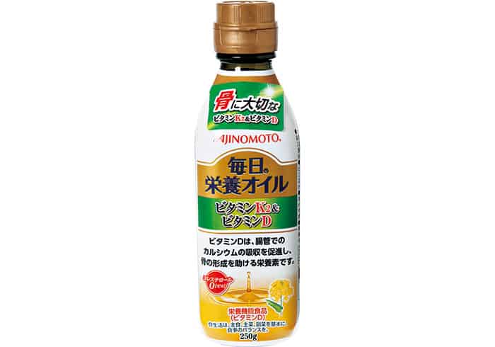骨の健康維持に役立つビタミンK2とビタミンDを配合したオイル。熱にも強く、あらゆる調理に取り入れやすい。250g980円(参考価格)(J-オイルミルズ TEL 0120・211・228)