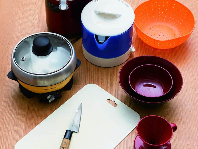 取材旅行には常に携行するという自炊に必須の七つ道具。上から時計回りに、低速ジューサー、電気ケトル、シリコン製のザル、百均で買った食器、1人用コーヒードリッパー、まな板&包丁、小型卓上電気鍋。