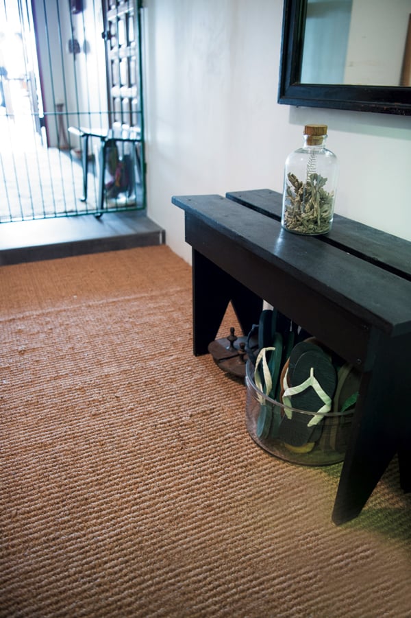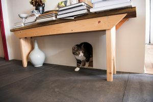 ほかにも、猫のための工夫があちこちに。例えば寝室と、餌があるリビングの間の壁に作った、猫のための小さな通路。猫が自由に行き来できるだけでなく、ドアを常に開けておかずに済むから冷暖房効果を保てるという利点もある。壁に取り付けた引き出しは、猫たちの憩いの場。白くペイントして壁になじませた。玄関のマットは彼らが爪研ぎしても大丈夫なように、サイザル麻のものを選んでいる。