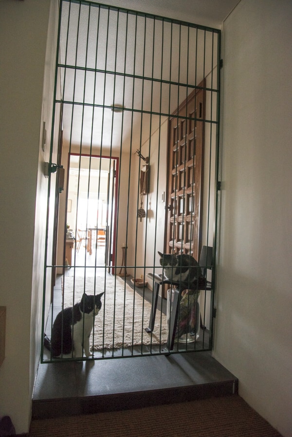 猫たちが誤って外に出ないよう、玄関と部屋の境目に取り付けた開閉式の鉄柵は、「繊細なデザインにしたくて、近所にある鉄の工房で教わりながら手作りしました」。縦棒の間隔は、いちばん小さいメグが通れない絶妙な幅。手作りだから、それが実現できた。