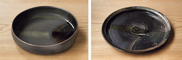 土屋さんといえば黒唐津だ。その出会いは、窯元巡りをしていた20代の頃。深い黒の陶片が目に飛び込んできた。神秘的な黒に魅了され、黒唐津が永遠のテーマとなった。土を替えたり天然の土灰を替えたり、黒に発色する鬼板を探したり。納得できる色が誕生するまで3年がかかった。しっとりと吸いこまれるように奥深い黒の器はモダンだが、あじわい深い幽玄の美も感じさせる。