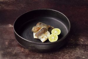 焼き魚とスダチが黒の器に映えてさらに美味しそうに見える。盛ったのは自家製カマスの干物。黒唐津平鉢 φ21×H5cm 1万円。