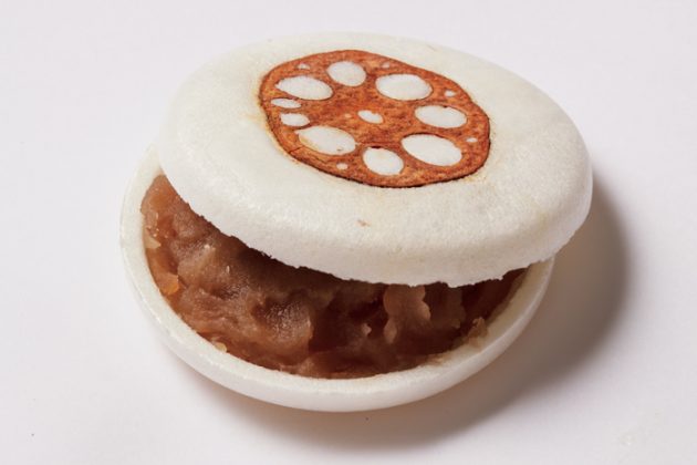 蓮根スライスがのせられたパリパリの薄い最中に、シャキシャキの刻み蓮根が入ったなめらかなあんを、自分で挟む。「日持ちもするので贈り物にも」。1個 266円。取り寄せ可。