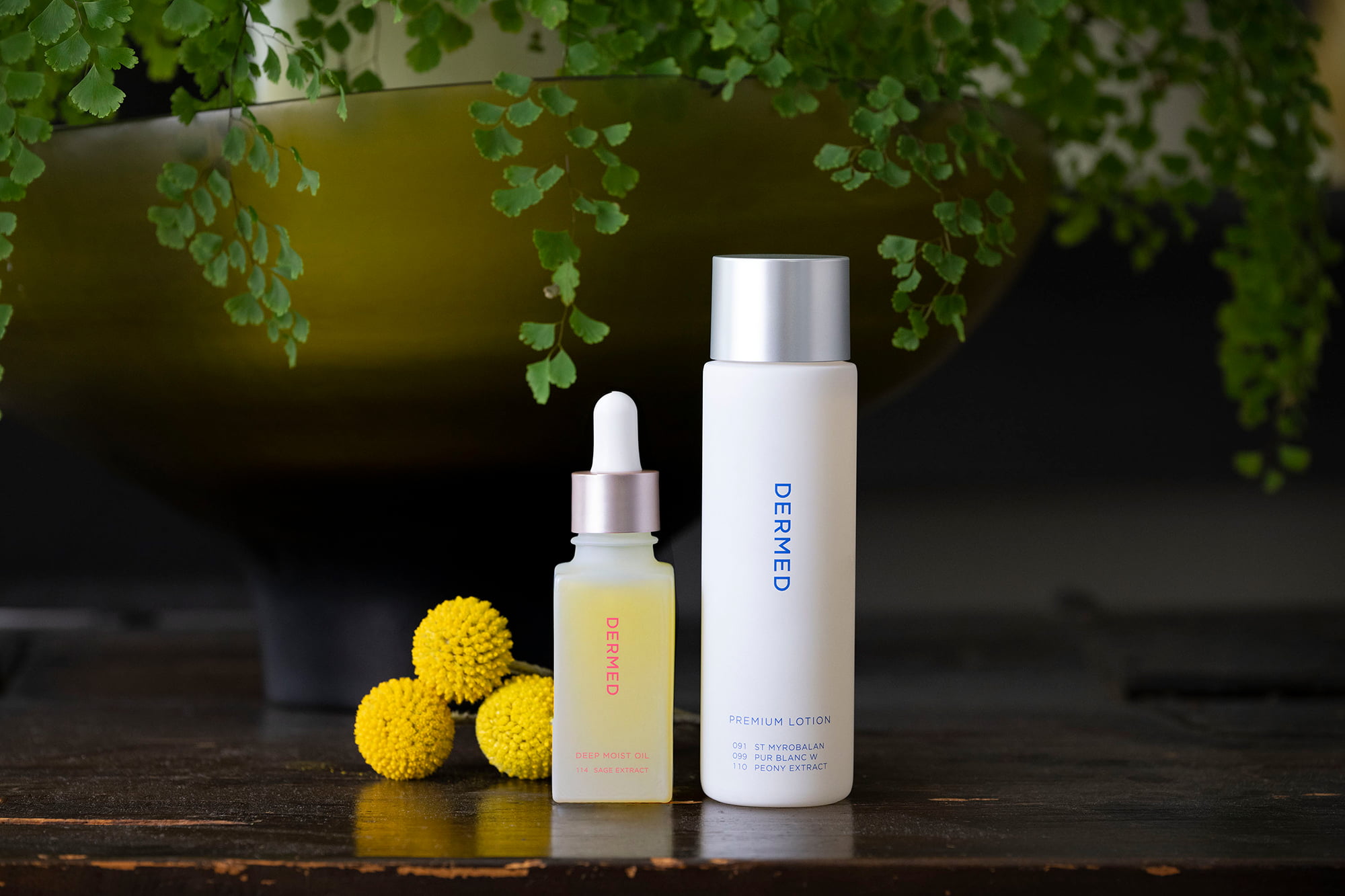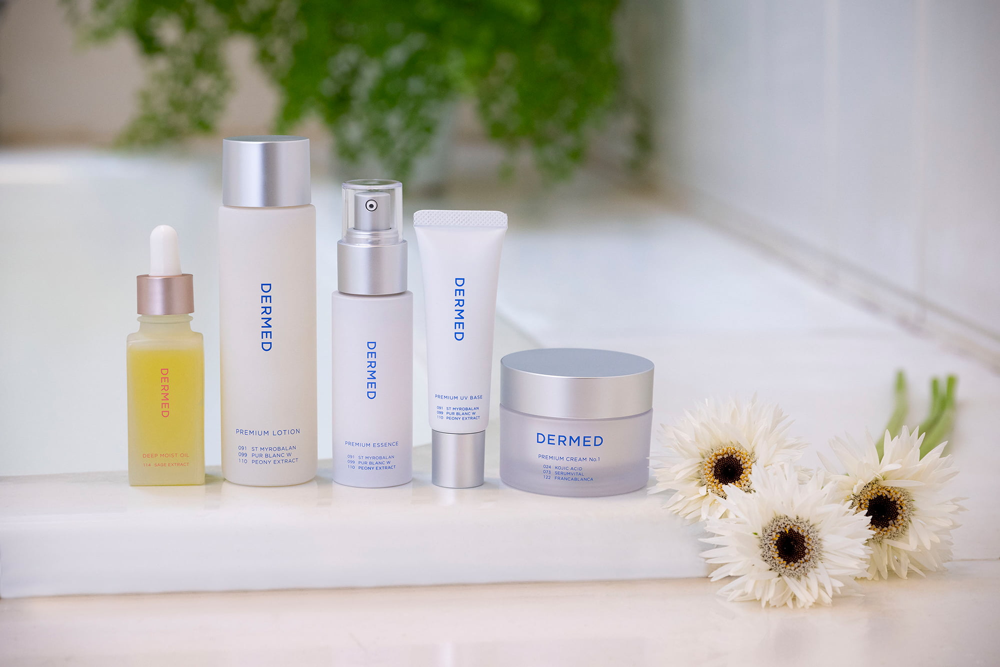 〈デルメッド〉というブランド名は、「DERMATOLOGY(皮膚科学)」「MEDICAL(医療の)」「MEDICINE(医薬)」という3つの言葉から生まれました。三省製薬の「医薬品で培った技術を生かし、効果の高い化粧品をつくる」姿勢をあらわしています。美木ちがやさんも愛用するラインナップは、左からデルメッド ディープモイスト オイル(30mL)、プレミアム ローション(120mL)、プレミアム エッセンス(40mL)、プレミアム UVベイス(18mL)、プレミアム クリーム No.1(35g)。