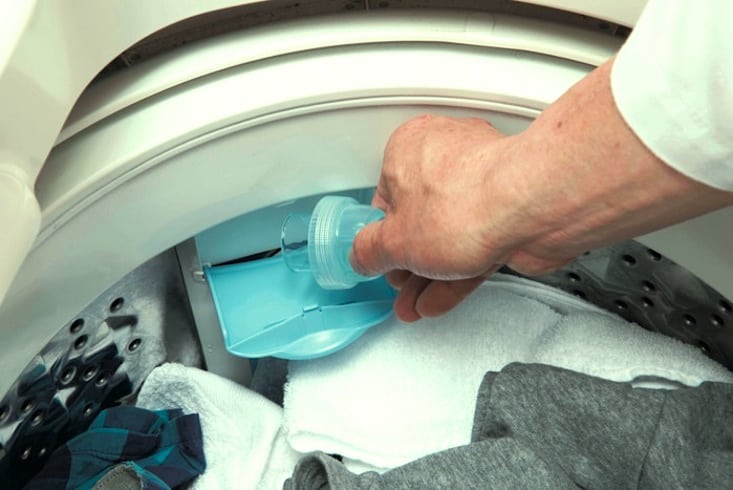 全自動洗濯機の洗剤投入口を確認し、洗剤、漂白剤、柔軟剤を正しく使うことが大切。機種にもよるが、液体洗剤と漂白剤は通常一緒の投入口、柔軟剤は別の投入口に入れるので、くれぐれも間違わないように。